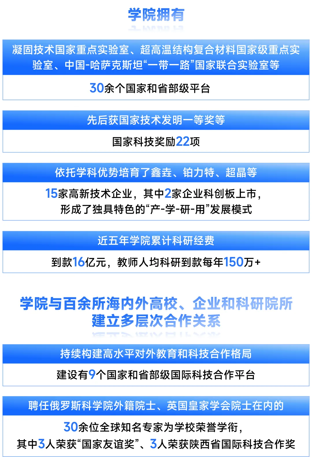 事业编制,聘为教授、硕导、博导,正高级职称。首聘期结束后经评审纳入长聘教授岗位。75万年薪标准,同时享受科研绩效、突出贡献奖励等其他收入。学院额外提供10万绩效奖励或20万平台建设费。提供硕士生、博士生招生指标,支持招收博士后。入职前三年招收的博士后,薪酬由学校全额承担(博士后年薪24-29万)。子女享受西工大附属中小幼优质教育资源(全国顶尖)。鼓励开展交叉研究与合作,可申请学校翱翔青年科学家工作室支持。提供良好的科研平台,学院科教实践与材料分析创新中心提供配置完备的200余台套大型分析测试仪器设备,及全天候开放共享自主测试服务。享受“三秦优才卡”,享受省内机场、铁路客运站贵宾服务,医疗系统“绿色通道”,三甲医院体检,省内A级景区免门票等高层次人才专享服务。海外优青进入答辩暂未通过者,经一定程序纳入学校“翱翔海外学者”支持(55万年薪标准+100万科研经费+40万安家补贴)。欢迎海外优秀人才咨询并依托西北工业大学材料学院申报海外优青等国家各类人才引进计划(领军、青年、博士后)。2021-2024年,19人依托我院入选海外优青等国家级人才引进计划。12月起,学院启动新一轮申报培训,将组织多轮政策指导、经验分享、申报书一对一修改。我们将凭借丰富的申报经验为您提供政策咨询、申报辅导、专家指导等全过程支持保障。欢迎有意申请者来信来电咨询,邮件主题“海优申报-姓名”。包括高性能铝合金、高温合金、钛合金、镁合金、铌合金、核能金属材料及金属间化合物等,超导材料、超导物理,金属凝固科学与技术,先进材料服役性能及可靠性。包括碳/碳复合材料、陶瓷基复合材料及其构件智能制备技术、高温特种材料与涂层等。包括辐射探测材料与器件、先进润滑与密封材料、生物医用材料和智能材料等。包括金属精确塑性成形、增材制造、精密铸造和连接技术等。包括液相激光制造与低碳能源器件、深海/深空储能电池材料与技术、基于机器学习的极端条件材料与器件、柔性光伏与光储一体集成技术、生物微能源和诊疗一体化等。包括材料信息学与数据科学、数字孪生与材料设计,高通量材料集成计算、高通量材料制造与服役表征评价技术等。超导材料技术与应用研究院(陕西西安):超导材料、超导物理、超导器件、超导应用等。清洁能源研究院(江苏太仓):核材料与技术、光伏材料与器件、储能材料与器件、氢能材料与技术等。轻质高温高强结构材料及构件精确成形技术研究中心(重庆两江):材料基因工程与智造、新型金属材料与近净成型技术、精密铸造与智能装备等。