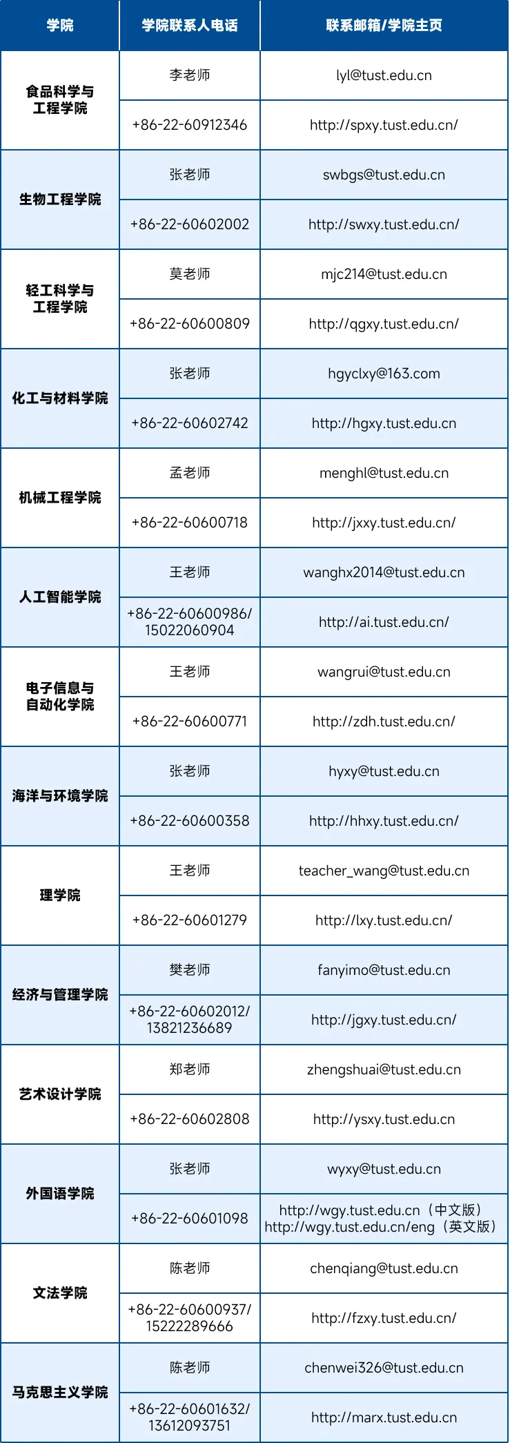 有意向依托我校申请者,可发送个人详细简历至相关学院联系邮箱,并抄送天津科技大学人事处联系邮箱(hr@tust.edu.cn)。我们将及时与您联系,帮助您全面了解有关申报信息,为您提供全面的咨询及申报服务。
