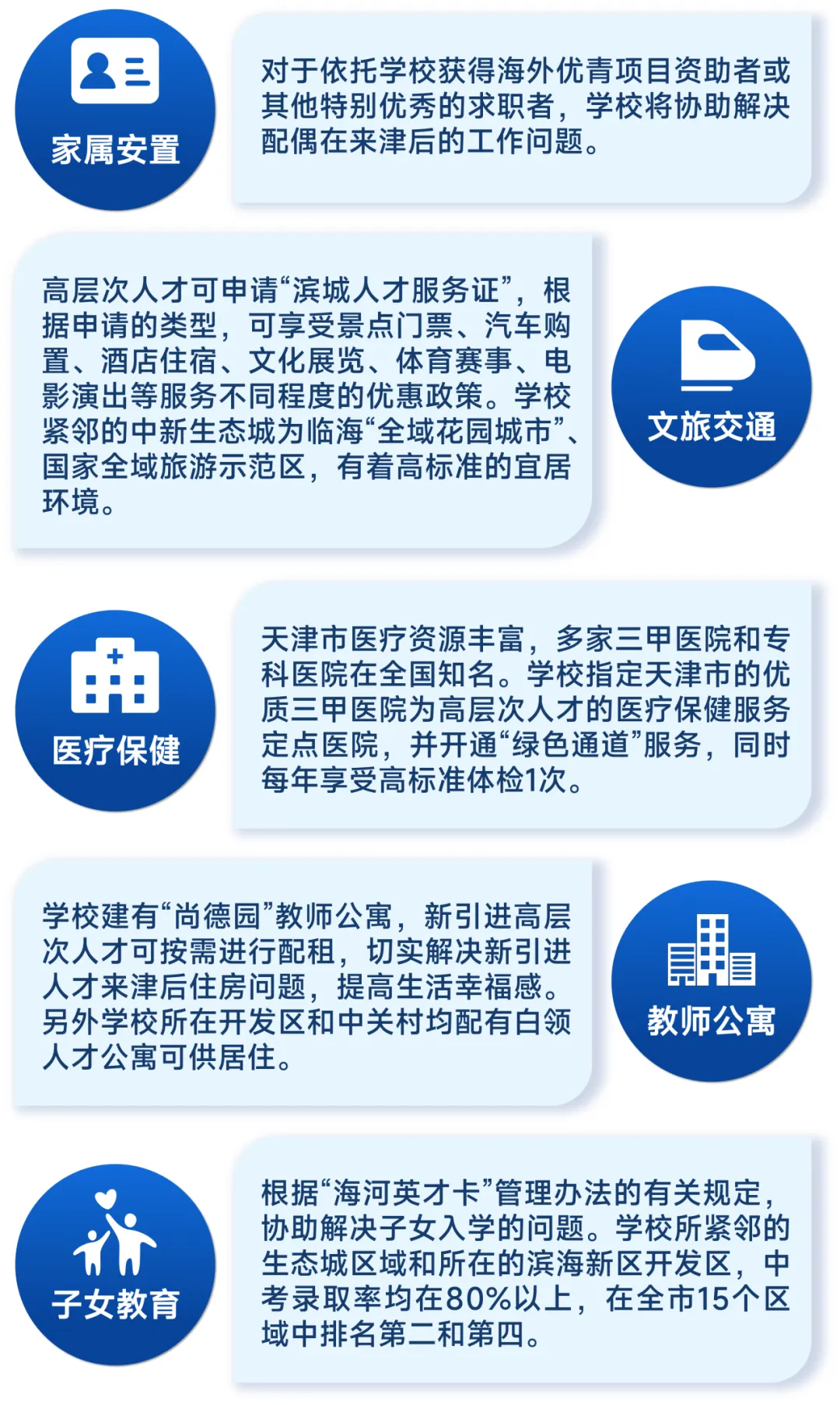 (1)入选重点引才项目后,出站回国到我校全职工作,聘为学校“天科人才”四级B岗或以上岗位(事业编制,特聘教授岗位),直聘为教授或副教授;