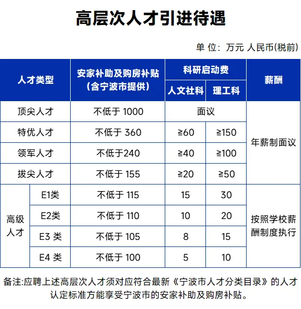 学校简介 学校成立于2001年6月,前身为浙江大学宁波理工学院。2020年1月转设为“浙江省人民政府管理、宁波市人民政府举办、浙江大学支持办学”的全日制公办普通本科高校。宁波市和浙江大学的“名城名校”合作办学模式,支撑引领学校创新发展、整体跃升。2015年,学校被确定为浙江省首批应用型试点示范高校;转设后排名稳定在软科中国大学排行榜主榜全国第250余位;2024年开始自主培养硕士研究生。同年9月,宁波市出台《关于支持浙大宁波理工学院建设一流创新性应用型大学行动方案》,着力将学校打造为应用型高校改革的“宁波坐标”。 当前,学校按照“立足宁波、依托浙大、放眼全球”发展思路,坚持“为国家和地区培养卓越专业人才”重要理念,致力于培养“德智体美劳全面发展,具有人文精神和科学素养的高素质应用型创新人才”,加紧加快建设具有“港城特色、浙大底色、理工本色”的一流创新性应用型大学! 浙大宁波理工学院热忱欢迎海内外优秀人才加盟,携手事业发展,共创美好未来。 引进人才的基本要求 热爱教育事业,理想信念坚定,师德高尚,学风正派,治学严谨,具有良好的合作精神,身心健康,全职到岗工作。 人才引进类别及引进条件 浙大宁波理工学院高层次人才引进类型包括:顶尖人才、特优人才、领军人才、拔尖人才、高级人才(E1正高年龄不超过45周岁、E2副高年龄不超过40周岁、E3海内外优秀博士年龄不超过32周岁、E4博士年龄不超过35周岁)。具体分类标准和条件请咨询工作人员。 招聘岗位 详见 附件1 2025年高层次人才(教师)需求计划汇总表 人才引进待遇 1.提供宁波市事业编制岗位。 2.符合条件的引进人才可申请浙江大学等高校联培研究生指导教师资格及博士后合作导师资格。 3.可协助解决过渡性住房及子女入学、入托等。 应聘方式 请将个人简历(包括个人基本信息、学习和工作经历、主要学术成果等)发送至:zrsc@nbt.edu.cn,同时抄送应聘岗位所在单位的联系人邮箱,邮件标题为“姓名+专业+应聘学院+应聘人才类型”。 学校联系方式 联系人:郑老师 联系电话:0574-88229016 学校网址:www.nbt.edu.cn 电子邮箱:zrsc@nbt.edu.cn 通讯地址:浙江省宁波市钱湖南路1号