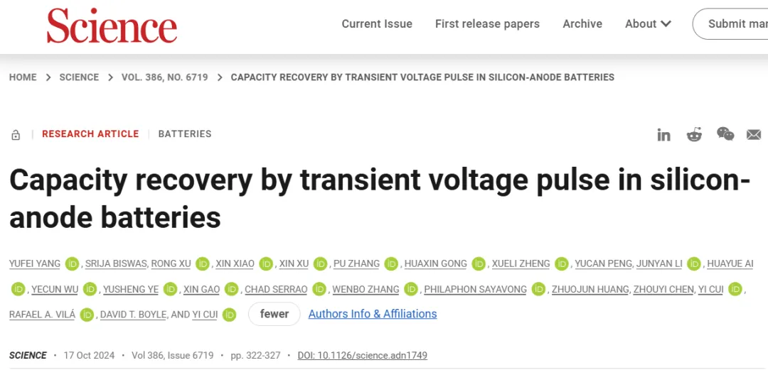 In situ formation of liquid crystal interphase in electrolytes with soft templating effects for aqueous dual-electrode-free batteries. Nature Energy, 2024, https://doi.org/10.1038/s41560-024-01638-z.发现金属锂电池在放电态进行休息,可以恢复容量,发现其中机理,对电池寿命的大大增加提供解决方案, 由博士生Wenbo Zhang领衔,论文在Nature 上发表;CE和TGC数据图——说明从放电状态休息的容量恢复Recovery of isolated lithium through discharged state calendar ageing. Nature (2024). https://doi.org/10.1038/s41586-023-06992-8发现交流电泳现象可以用来恢复硅负极的容量,让高能量密度硅负极电池寿命大大延长,由博士生杨羽飞领衔, 论文在Science上发表;Capacity recovery by transient voltage pulse in silicon-anode batteries. Science (2024). DOI:10.1126/science.adn1749冷冻电镜材料领域的又一大突破:崔屹等人在外加电压的条件下,把有电活性的催化剂快速冷冻,发现惊讶的亚稳定态,该方法对材料及生物领域都会产生深远的影响,由博士生李彦彬领衔,论文在Nano Letters上发表;Electrified Operando-Freezing of Electrocatalytic CO2 Reduction Cells for Cryogenic Electron MicroscopyRobert Sinclair, Nano Letters.2024. DOI: 10.1021/acs.nanolett.3c03000发明多孔集流体技术把锂电池充电速度提高4倍,由博士后叶玉胜领衔,论文在Nature Energy上发表;Quadruple the rate capability of high-energy batteries through a porous current collector design. Nature Energy (2024). https://doi.org/10.1038/s41560-024-01473-2高能量密度金属锂电池界面SEI膜形成的机理解析,对寿命和安全性有大的影响,由博士后Weilai Yu领衔,和鲍哲南老师共同指导完成,论文在Nature Chemistry上发表,Weilai Yu即将在多伦多大学开始做教授;