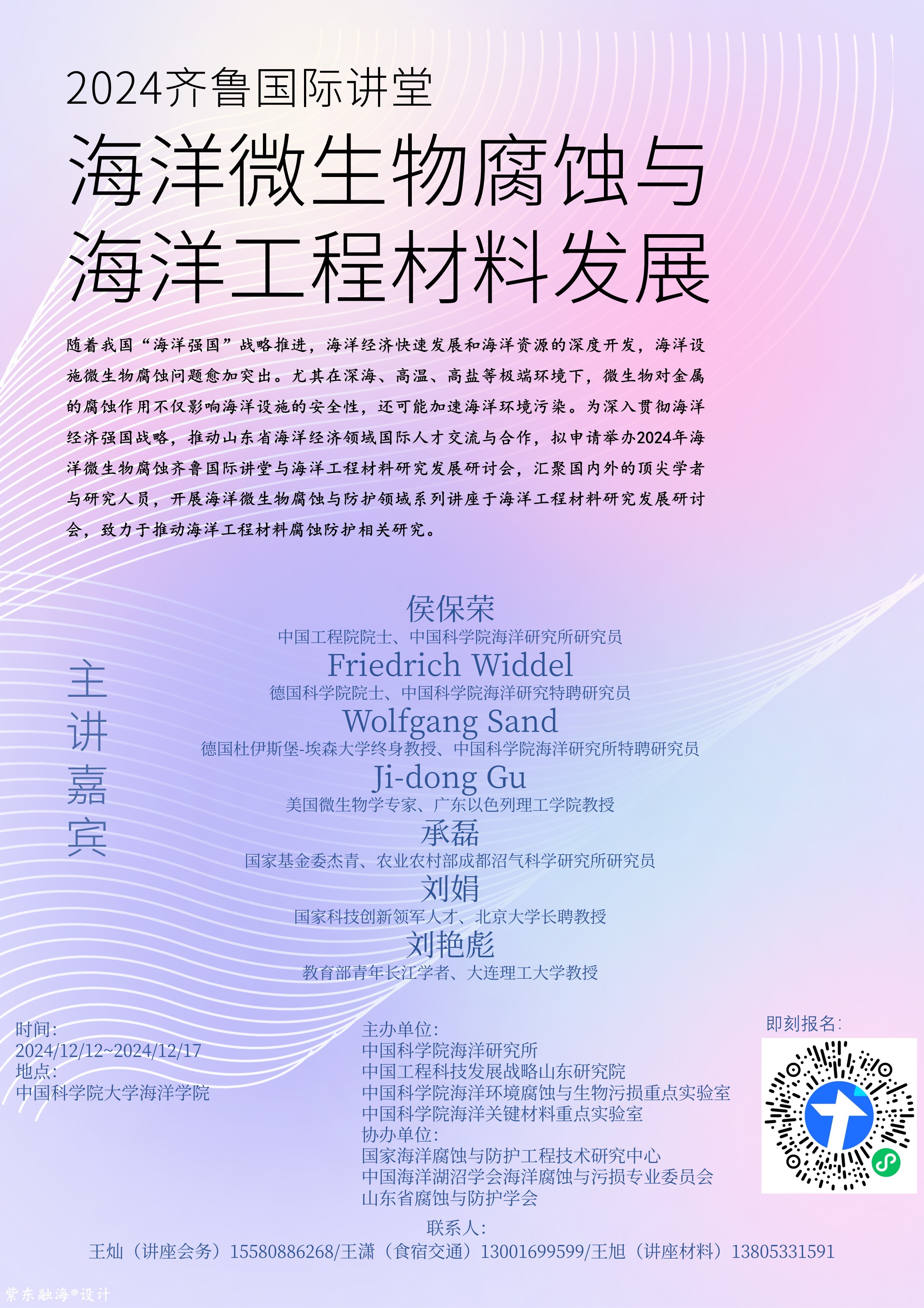 为深入贯彻海洋经济强国战略,推动山东省海洋经济领域国际人才交流与合作,由中国科学院海洋研究所、中国工程科技发展战略山东研究院、中国科学院海洋环境腐蚀与生物污损重点实验室、中国科学院海洋关键材料重点实验室主办的2024齐鲁国际讲堂将于2024年12月13日至17日在青岛召开。本次齐鲁国际讲堂将围绕海洋微生物腐蚀与海洋工程材料发展等多个方向,加快山东省海洋工程材料腐蚀防护研究与发展,加强国际合作与成果转化,促进海洋工程材料腐蚀领域学术交流,为我国海洋工程技术的可持续发展提供理论依据和实践指导。