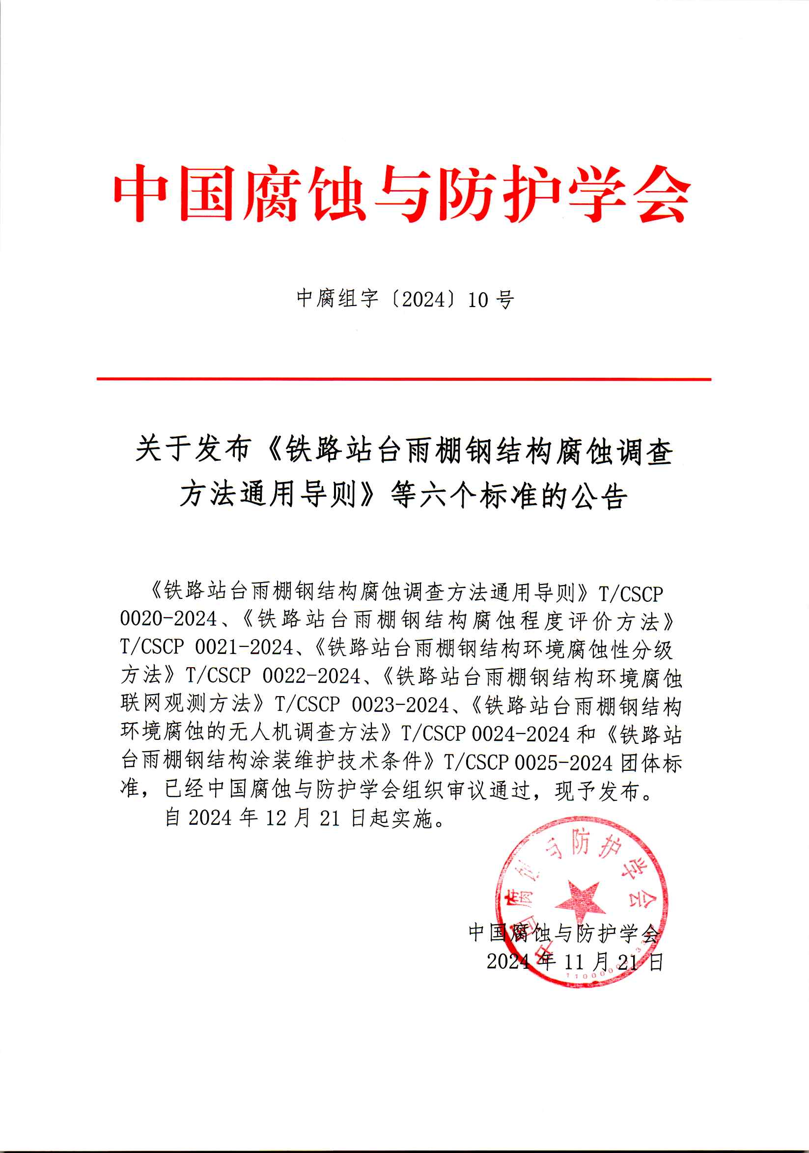 中国腐蚀与防护学会-关于发布《铁路站台雨棚钢结构腐蚀调查方法通用导则》等六个标准的公告