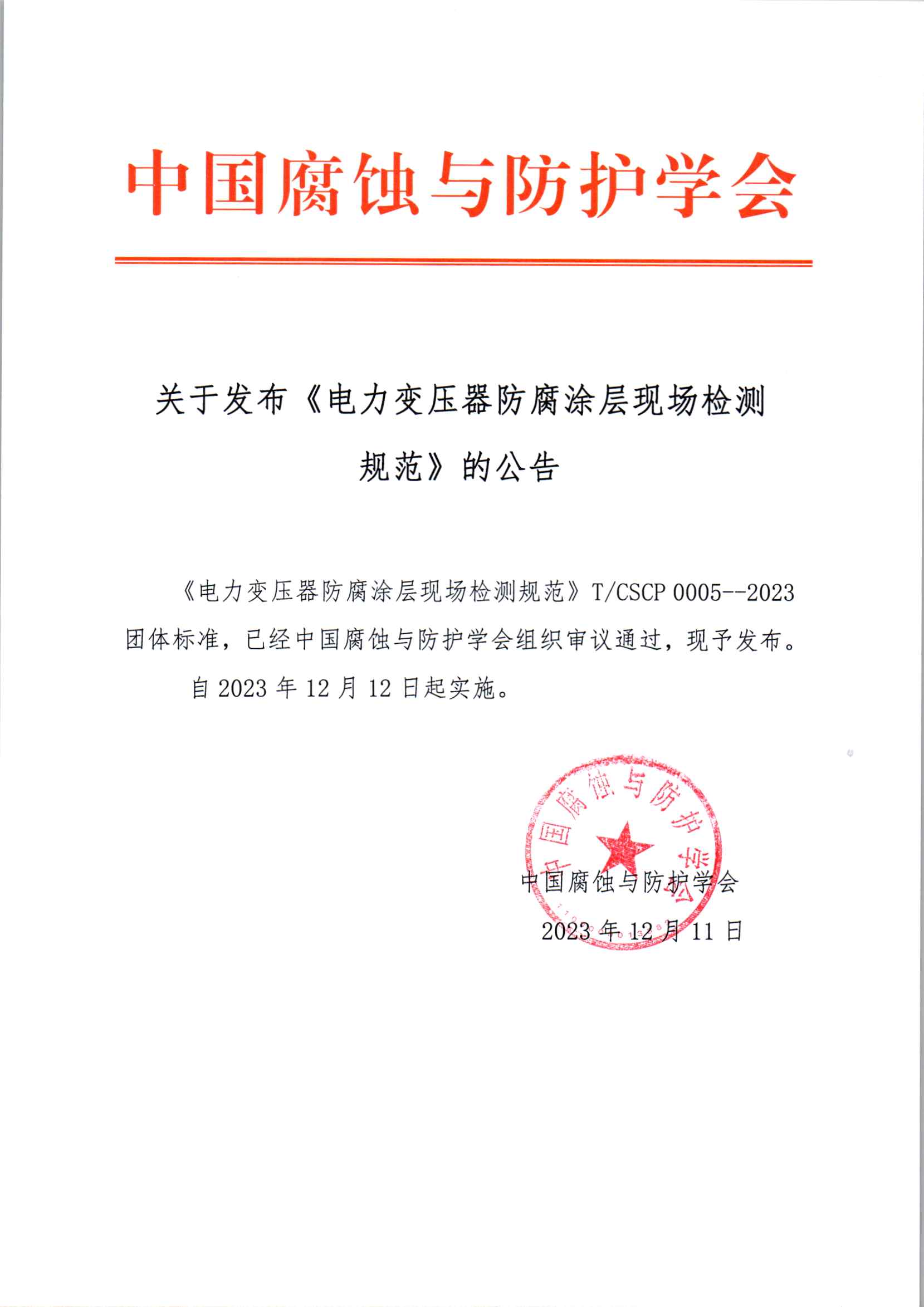 中国腐蚀与防护学会-关于发布《电力变压器防腐涂层现场检测规范》标准的公告