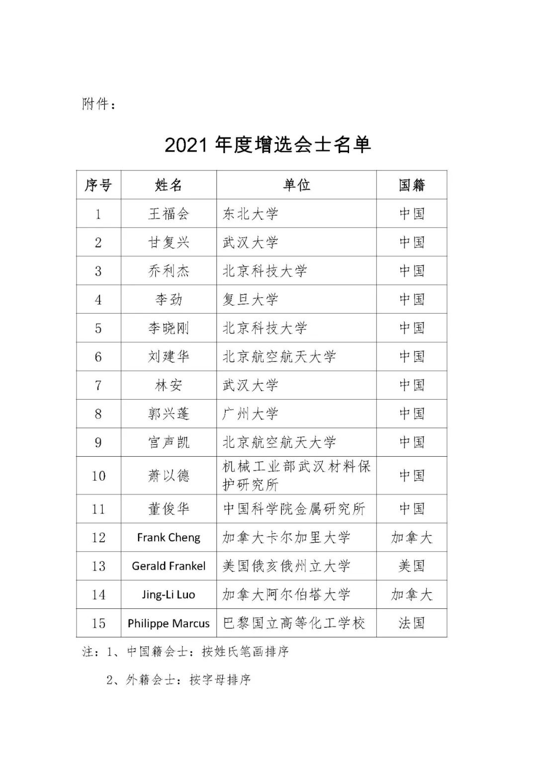 2021 年度中国腐蚀与防护学会增选会士名单如下: