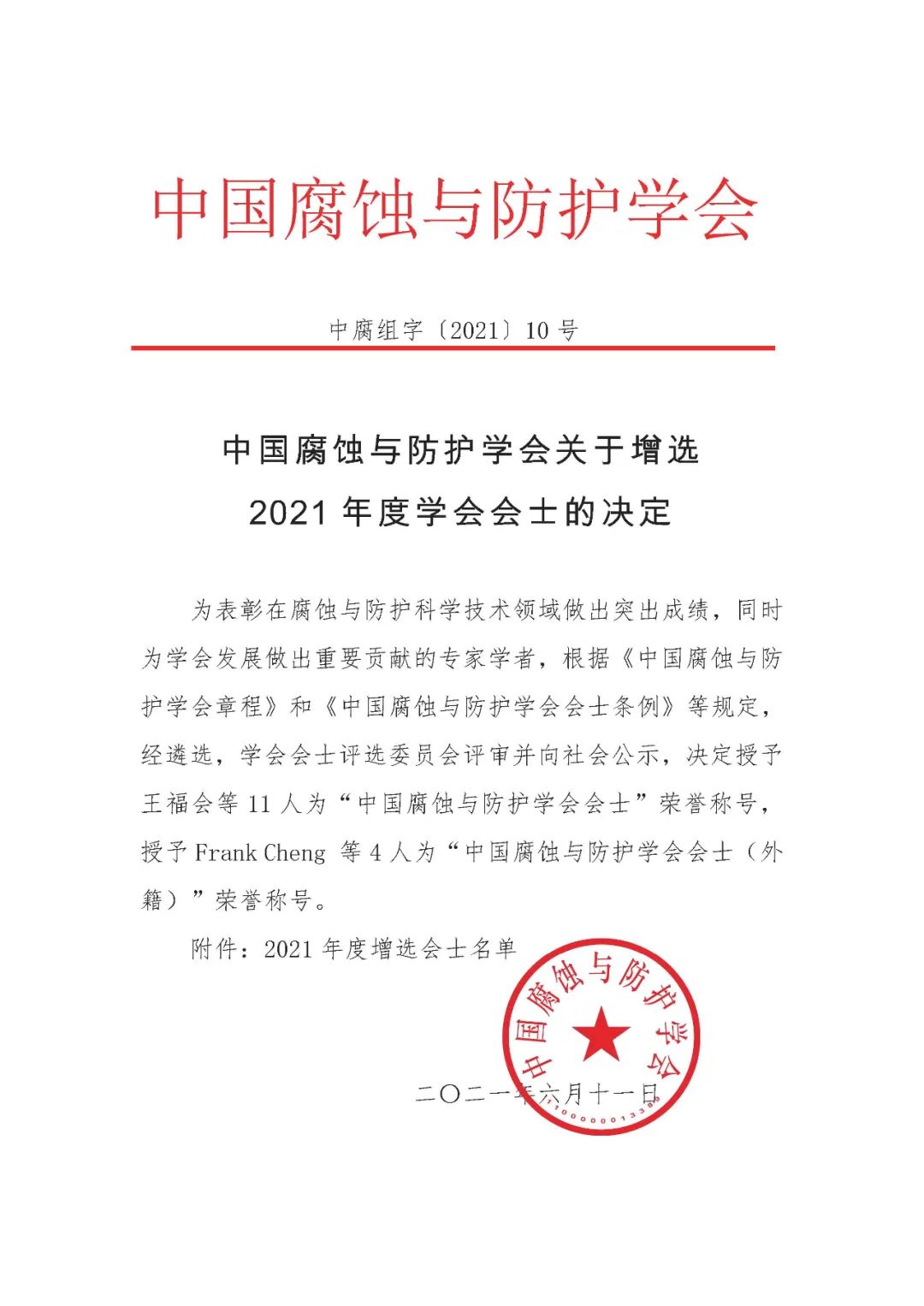 2021年,为表彰在腐蚀与防护科学技术领域做出突出成绩,同时为学会发展做出重要贡献的专家学者,根据《中国腐蚀与防护学会章程》和《中国腐蚀与防护学会会士条例》等规定,经遴选,学会会士评选委员会评审并向社会公示,决定授予王福会等 11 人为“中国腐蚀与防护学会会士”荣誉称号,授予 Frank Cheng 等4人为“中国腐蚀与防护学会会士(外籍)”荣誉称号。