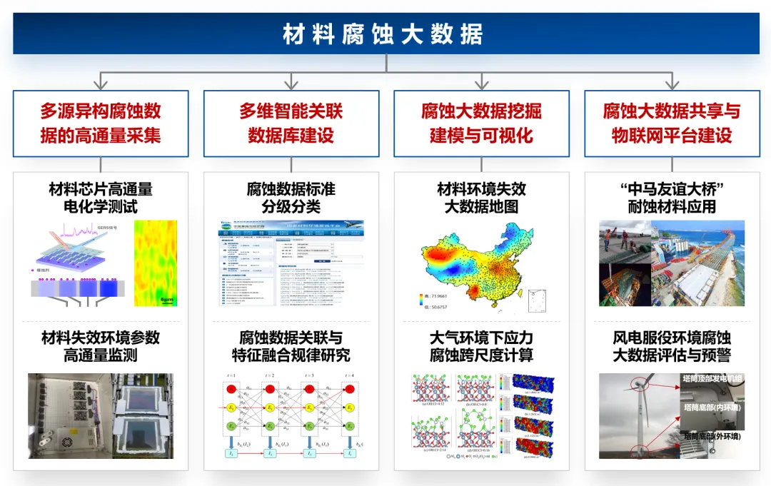 经过本次优化调整,新时期的国家材料腐蚀与防护科学数据中心在科技部支持下,由北京科技大学牵头,联合民口部门和国防部门共同建设运行。重点围绕国家重大工程建设以及战略性新型产业发展,以及“一带一路”、“2025先进制造”“”、“海洋战略”、“载人航天”、“互联网+”等国家重大科技和经济发展需要,构建了由30余个国家野外试验站和分布式腐蚀大数据观测试验站点构成的长期的国家级材料环境腐蚀和防护数据生产积累平台体系;建立了由47项行业团体标准和28项规范构成的环境腐蚀试验与评价技术新体系,发明了系列化的基于室内外相关性的室内腐蚀加速试验谱技术与新装备;持续开展了黑色金属、有色金属、建筑材料、涂镀层材料及高分子材料等5大类,600余种材料,最长达35年的野外试验数据和连续观测数据。建成了我国数据量最大、内容最丰富的材料腐蚀数据库和数据共享平台 ——“国家材料腐蚀与防护科学数据中心”,该平台一直是腐蚀与防护领域最重要的专业数据公益性共享门户网站,年访问量超过50万,每年为上千家单位提供试验和数据服务。共享对象涵盖了钢铁、机械、航空、航天、兵器、船舶、石油、石化、水利、电力、电子、金融、铁路和交通等众多涉及材料的行业以及科研院所、高等院校、政府和国防部门等;出版了国内外首部“材料腐蚀信息学”专著,并以“share corrosion data ”为主题在《nature》期刊发表了评述性研究论文,系统提出了“腐蚀大数据”概念及其理论框架与技术模式。