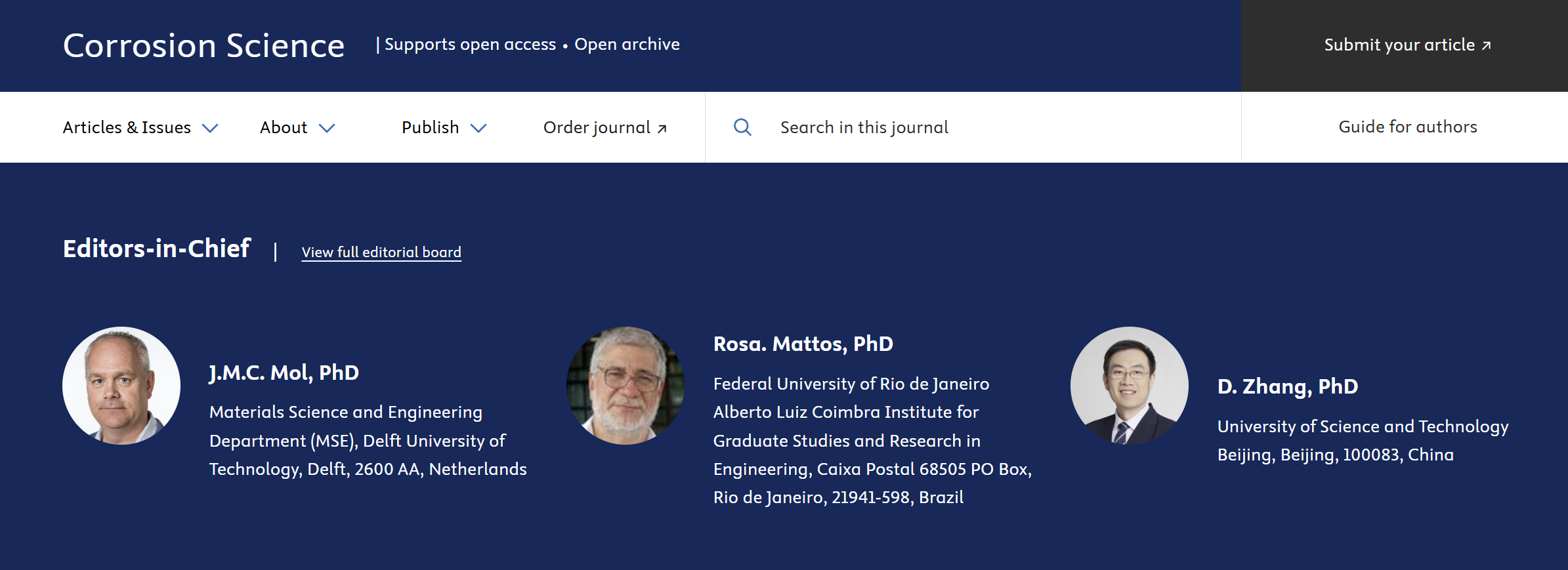 《Corrosion Science》杂志创刊于1961年,是材料失效与保护研究领域最重要的期刊之一,目前影响因子为8.5(中科院一区)。创刊以来,期刊先后由L.L. Shreir、T.K. Ross、J.C. Scully、G.T. Burstein、J.M.C. Mol和O.R. Mattos等6位学者担任主编。张达威教授自2018年担任该刊副主编,并于2026年1月升任主编一职。