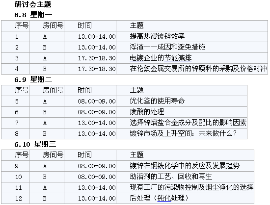 此次大会将提供德语、意大利语、西班牙语、法语、汉语、日语的同声传译。会议期间针对代表们所关心的热点议题还将在展厅设置小型研讨会,便于代表更深入地分享经验、探讨问题。同时,此次的商业展览会是热浸镀行业史上最大的一次展览,为镀锌行业人士广泛交流提供平台。此外,会后两天还将安排与会代表参观英国批量热镀锌企业,促进同行进行技术交流,还为随同人员安排观光旅游等活动。