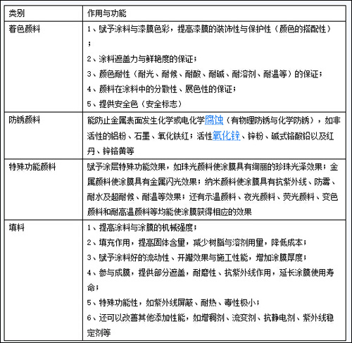 颜料是涂料色漆生产中不可缺少的成分之一。其作用除了为涂膜提供色彩装饰外,还可以为涂料提供更多的物理和化学性能的改善,如遮盖性、耐光性、耐候性、耐温性、耐化学药品性、光泽及机械强度等。在涂料中使用功能性颜料可以赋予涂料特殊性能,如特种装饰效果(金属质感、珠光光泽、夜光、荧光等)、防腐、防火、导电、抗静电、示温等特种功能。