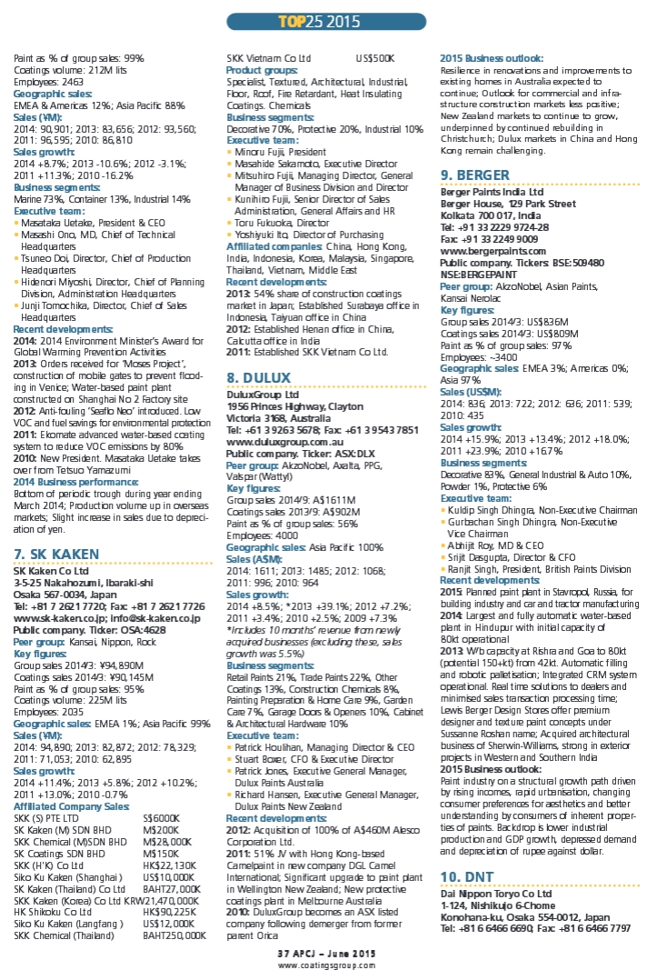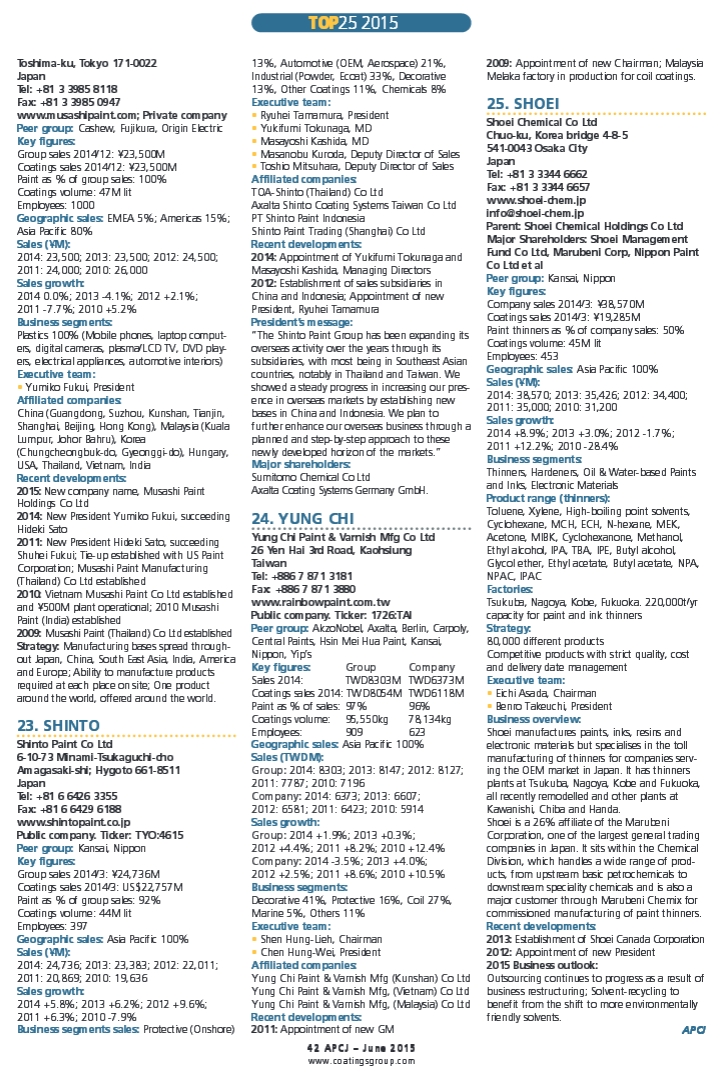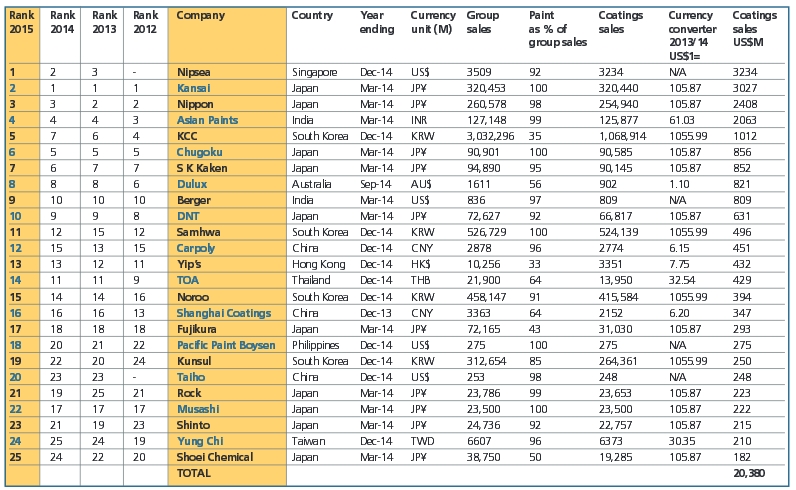近日,《亚太涂料杂志》(APCJ)公布了“2014年亚太地区涂料企业25强”榜单。此外,还公布了“2014年亚太地区涂料制造企业20强”榜单,该榜单是在亚太地区经营的全球性企业,只计算企业在亚太地区的2014年度销售数据。
