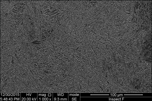 SIMP钢的制备是决定其性能的关键,其难点主要在于熔金属元素的熔解、超纯铁的制备、易活化元素含量的控制、成分均匀性控制、全部马氏体组织的获得等。自2011年起,课题组相继完成了近百炉25公斤级的实验室规模SIMP钢冶炼,在SIMP钢的主元素和活化元素的控制以及钢的纯净化冶炼方面积累了丰富经验。2012年完成了500公斤级SIMP钢的冶炼,成分得到严格控制,其中S含量可低至5ppm。2013年对SIMP钢的成分进行了进一步优化,并完成了1吨级SIMP钢的冶炼,同时为其它研究组提供了研究所需的焊接材料和管材。2014年完成了2吨级SIMP钢的冶炼,明确了铸锭在规模增大后可能产生的制备技术难点,如成分均匀性问题等。在总结以上冶炼经验的基础上,于2015年9月采用真空感应+真空自耗的工艺方法成功完成了5吨级SIMP钢的第一轮冶炼(制备过程如图1所示,5吨级铸锭形貌如图2所示)。化学成分分析结果表明,5吨级铸锭的主元素均为最佳成分点,S、P等杂质元素含量均控制在极低水平,Ni、Mo、Al、Nb、Ti、Co等各类活化元素的含量也均控制在极低水平。锻造和热处理后的显微组织形貌观察表明(图3),5吨级SIMP钢获得了全马氏体的目标组织,各项常规力学性能均优于目前核电用同类钢种T91钢。2016年1月完成了5吨级SIMP钢的第二轮冶炼,进一步完善和固化了SIMP钢的大规模冶炼工艺。
