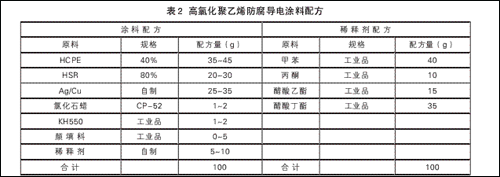 本试验选用防腐性能优异并且快干的高氯化聚乙烯树脂为涂料主要成膜物,用自制高固体树脂为增韧改性树脂,以提高涂层柔韧性、光泽、附着力和冲击强度等性能;用丙酮、乙酯、甲苯和醋酸丁酯组成的混合溶剂作为稀释剂,以提高涂料储存稳定性和施工性,确保涂层具有优良的外观、光泽等各项性能;用KH550处理的Ag/Cu为导电填料,克服了铜粉易被空气氧化而造成导电性下降的缺陷,又解决了纯银粉价格贵且在涂层中易迁移的问题,制成的防腐导电涂料具有优良导电性、防腐性和化学稳定性等综合性能,是一种具有发展前途的新型导电涂料。