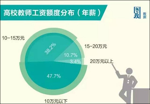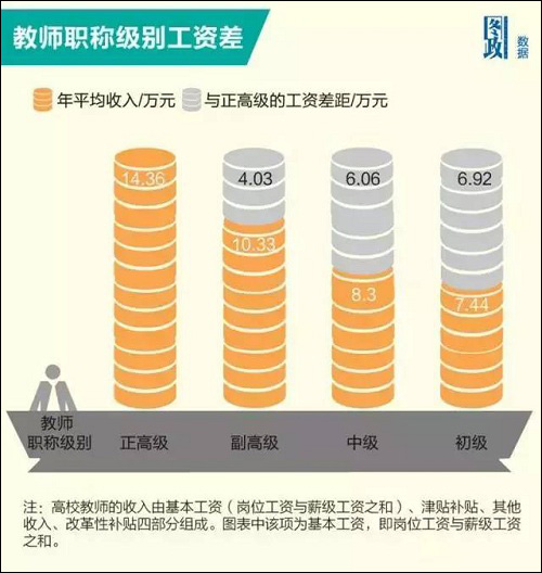 中国高等教育学会组织的2013年部分高校教师收入情况调查显示,年薪在10万元以下的教师占比近一半,20万元以上的占比不足5%。另一方面,工资额度与教师职称高低有直接关联,相邻两级的平均工资差异由低到高不断扩大。