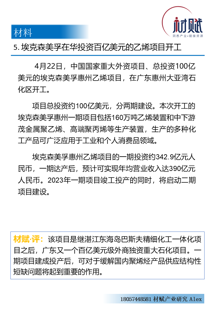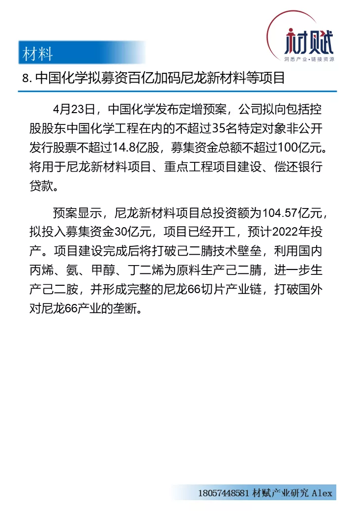 【4月20日-26日】100亿美元!又一外企重资布局中国市场;中国化学拟募资百亿加码尼龙新材料等项目