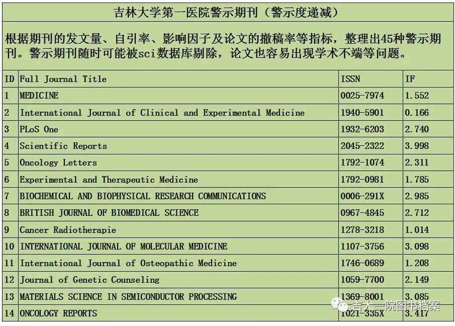 随着国内机构对水刊和学术不端的重视,越来越多的机构对SCI期刊进行黑名单管理,即对于某些质量不高的期刊,无法报销版面费,无法用于晋升,不纳入业绩。近日,吉林大学第一医院整理了45种警示期刊,警示期刊随时可能被SCI数据库剔除,论文也容易出现学术不端等问题。