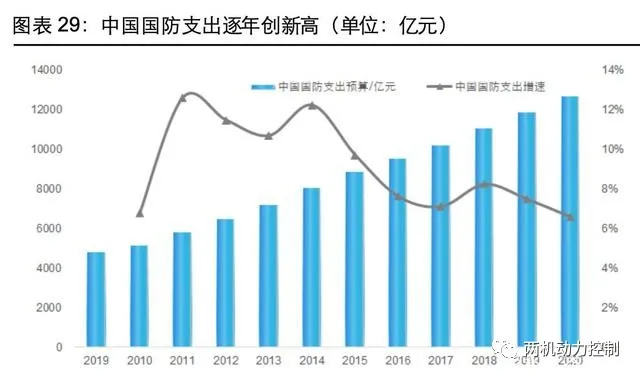 据 SIPRI 统计,全球国防支出总额自 2014 年起稳步增长。美洲一直为国防支出最多的 地区, 美国《2020 财年国防授权法案》通过的国防支出高达 7380 亿美元(增速约 2.8%);面对复 杂多变的国际局势和摩擦升级的外围 环境, 中国国 防支出 也逐年 创新高。根据财 政部发 布 的 《关于 2019 年中央和地方预算执行情况与 2020 年中央和地方预算草案的报告》,2020 年 中国国防预算 12680 亿元(增速约 6.6%),2011 至 2017 年间,国防费中装备费占比 已提升 至 41%,大力拉动先进装备的列装和旧装备的更新换代。