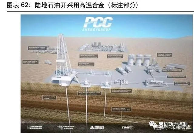 美国从 70 年代开始,逐渐将航空领域的高温合金转移到油气开采领域中应用。苏伦贝谢、 哈里伯顿等大公司,每年采购高温合 金的量 非常高 。在石 油和天 然气开 采,特别 是 深 井 开 采 中,钻具处于 4~150°C的酸性环境中,加之二氧化硫、硫化氢和泥沙等存在,必须使 用耐腐 蚀耐磨高温合金。中国中石油、中石 化大多 采用不 锈钢等 材料, 高温合 金的普 及度 较 低 , 高 温合金具有仍有较大替代空间。如下 图所示 ,所有 标注部 分美 国用的 都是高 温合金 。