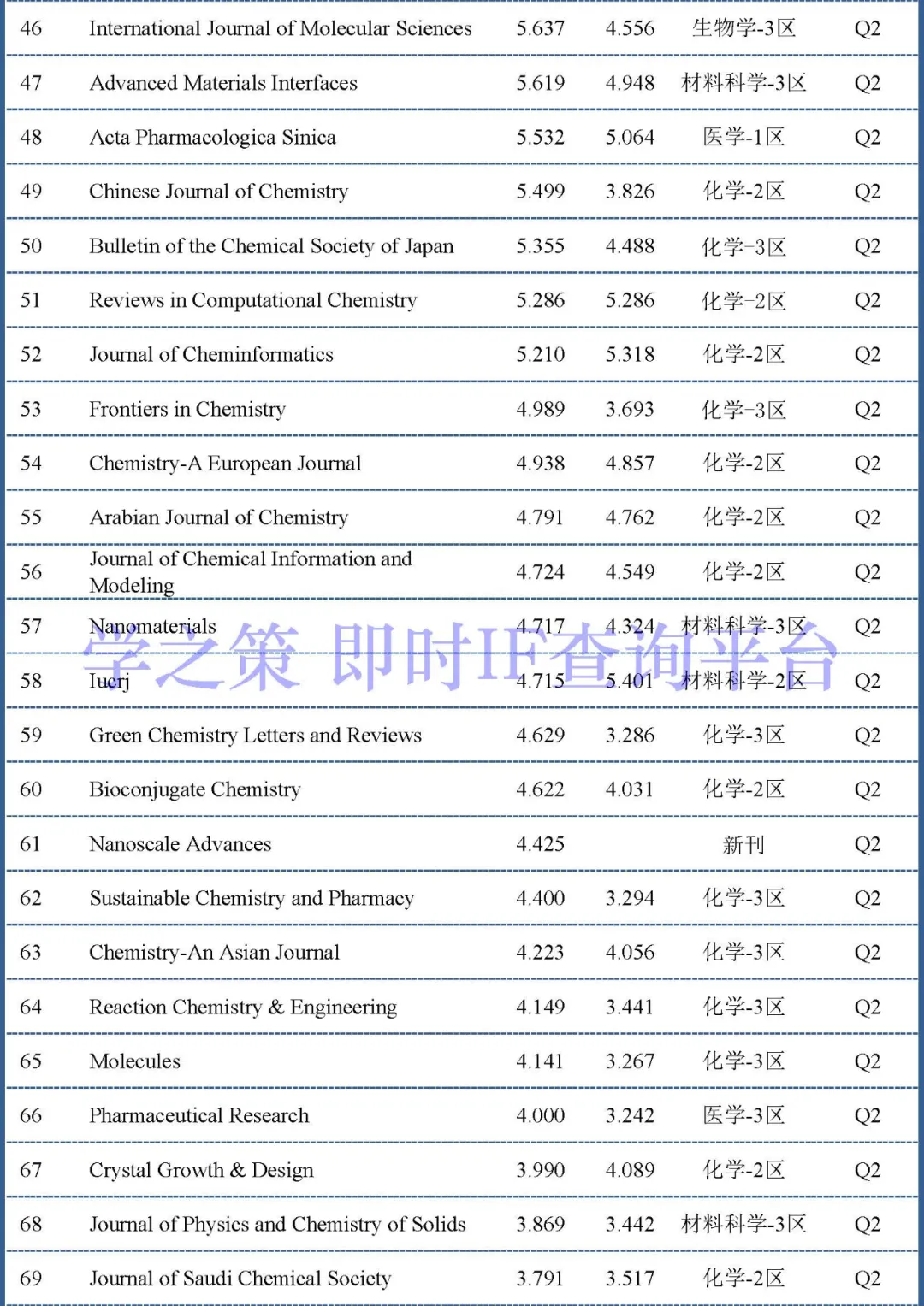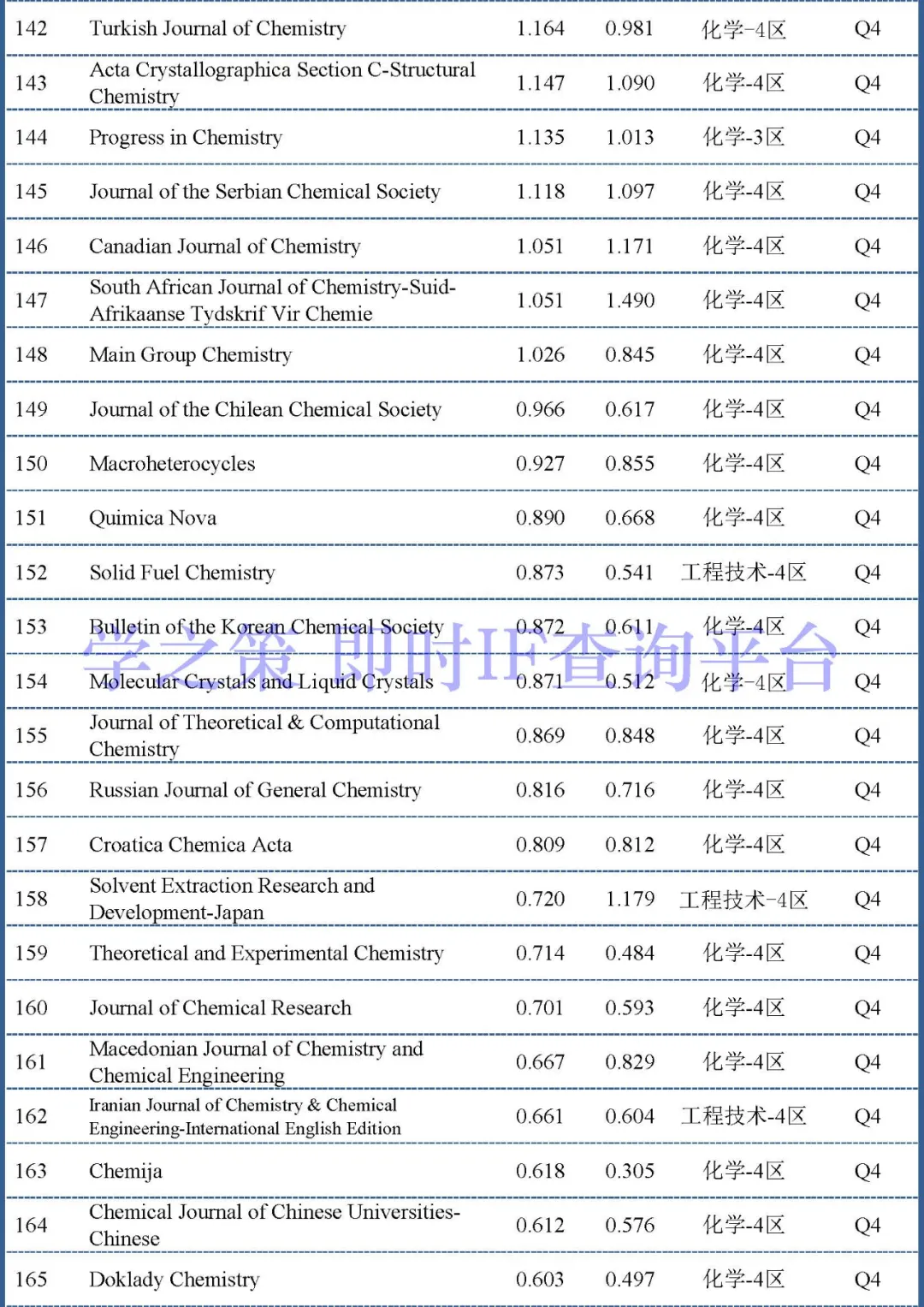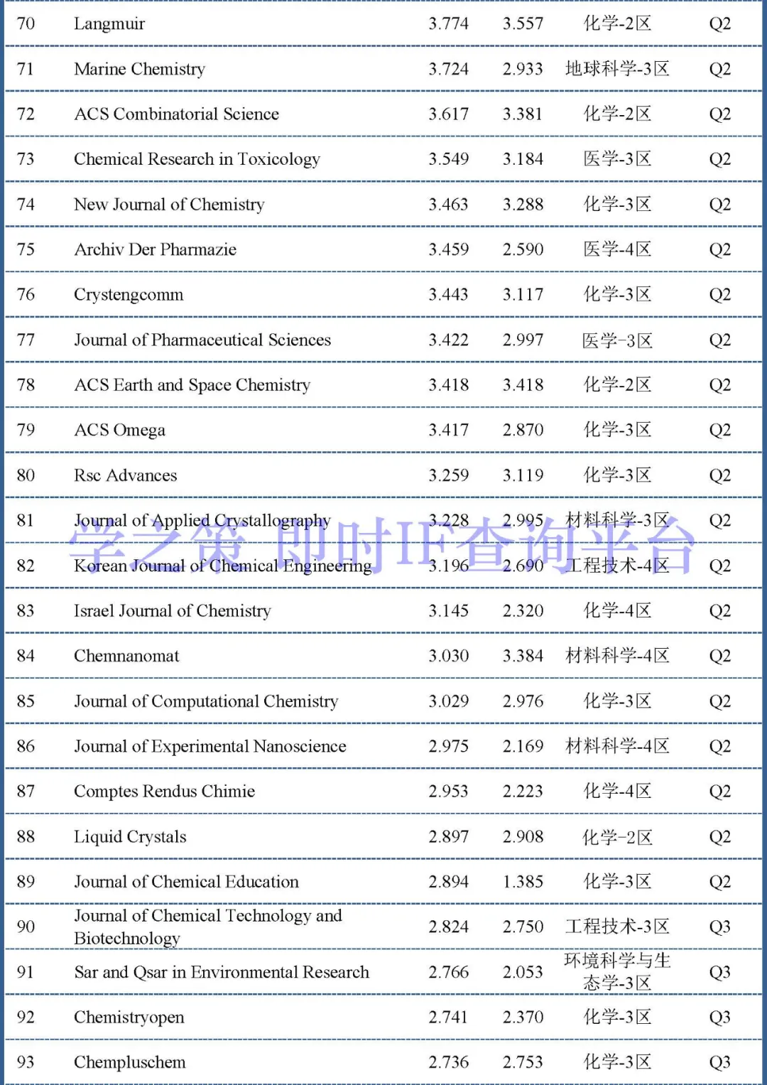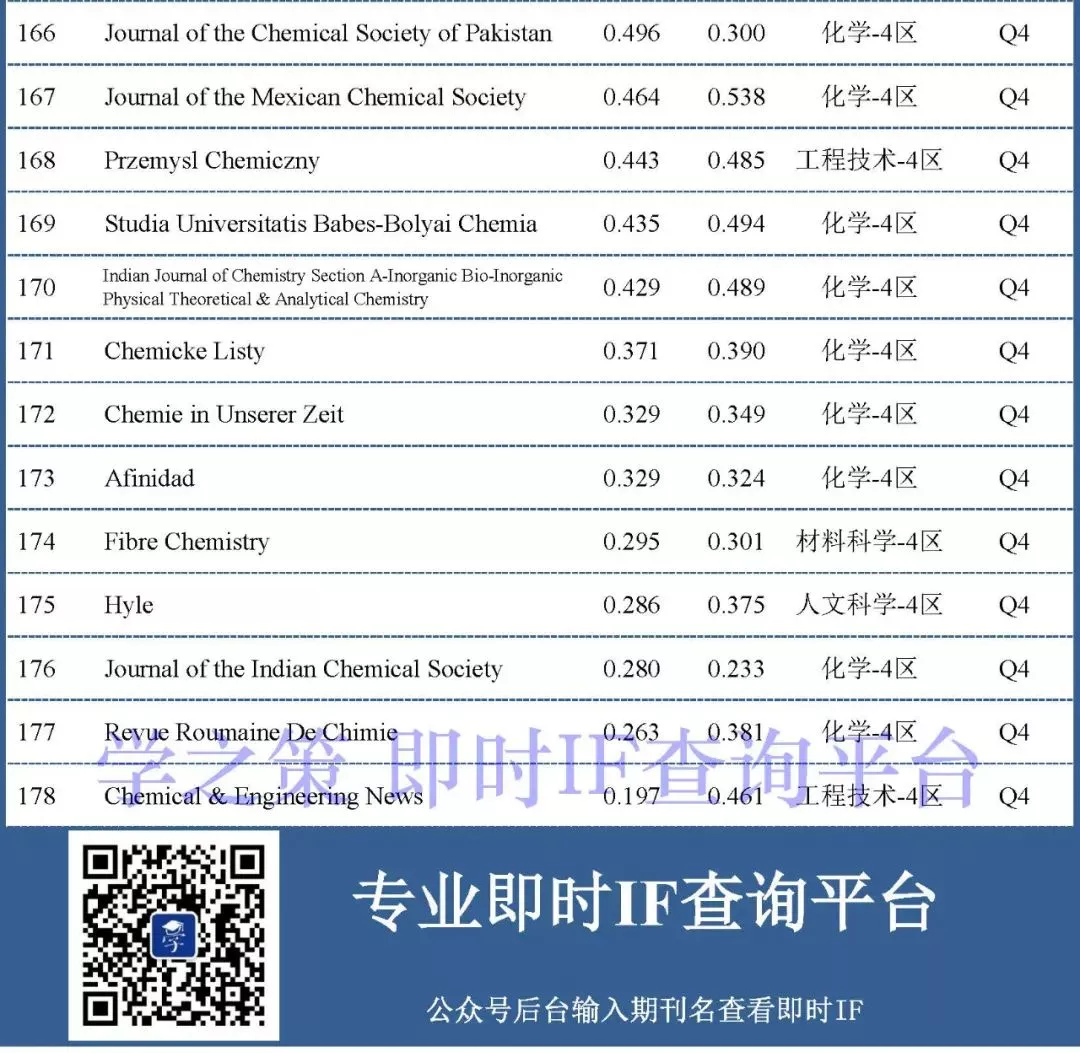 目前Q2和Q3的分界线两端是Journal of Chemical Education(即时2.894)和Journal of Chemical Technology and Biotechnology(即时2.824)。Q3和Q4分界线的两端是Journal of Chemical Sciences(即时1.398)和Monatshefte Fur Chemie(即时1.391)。