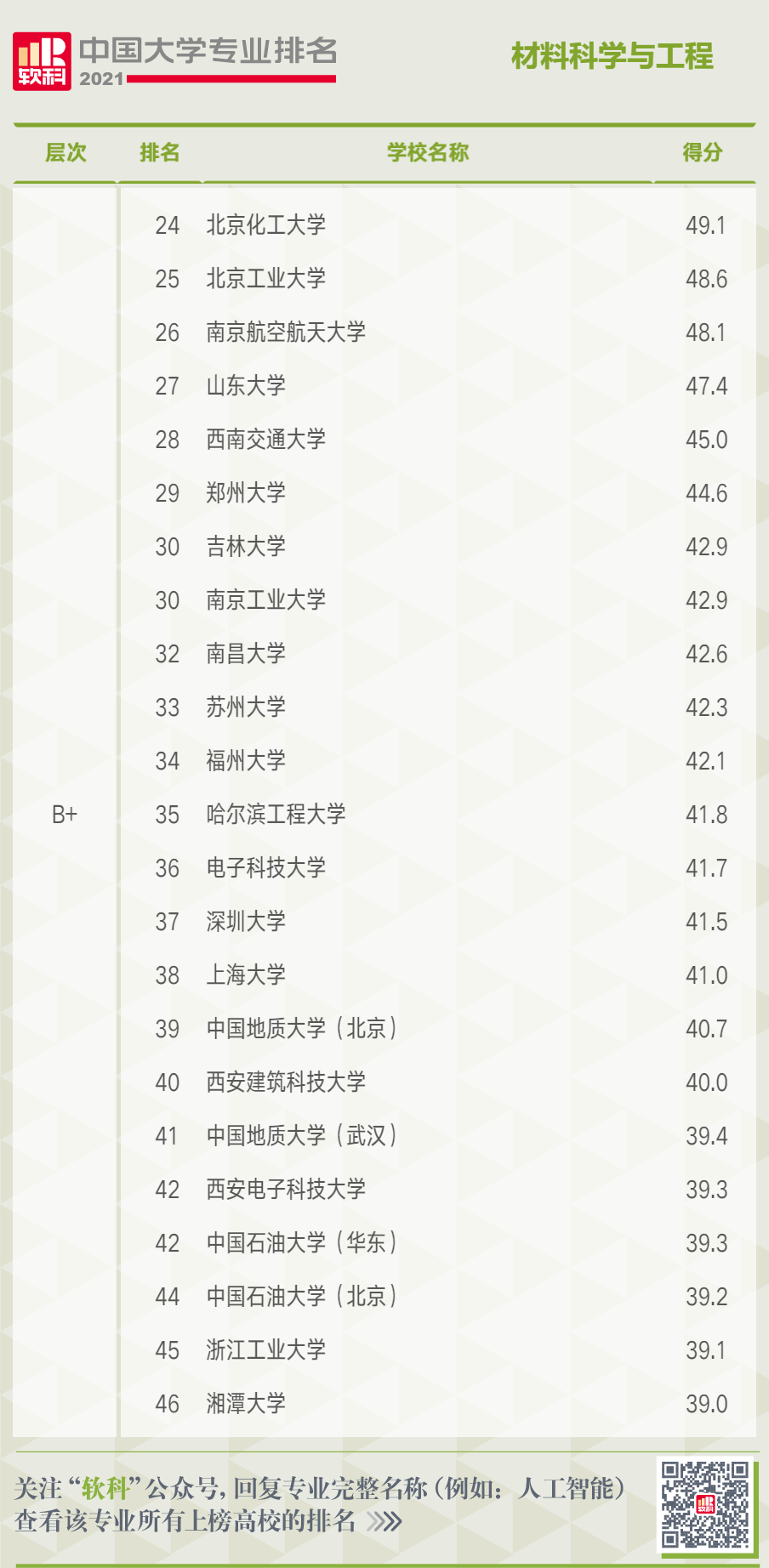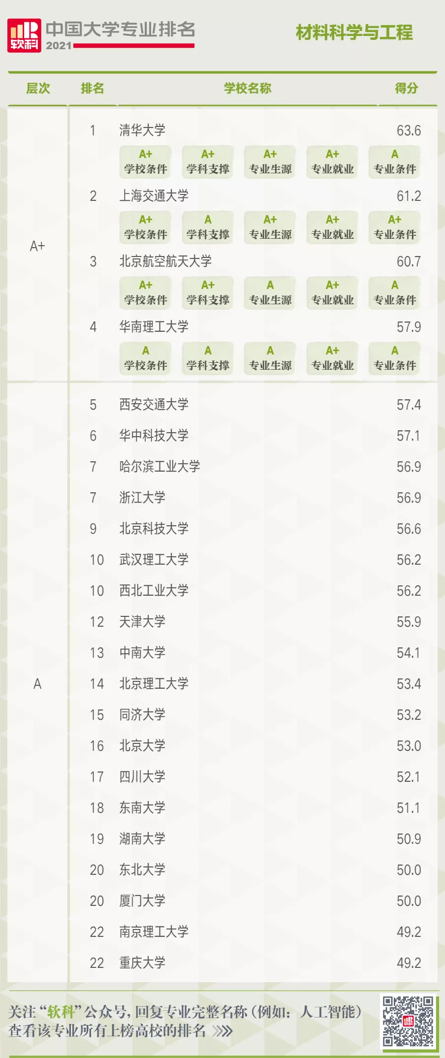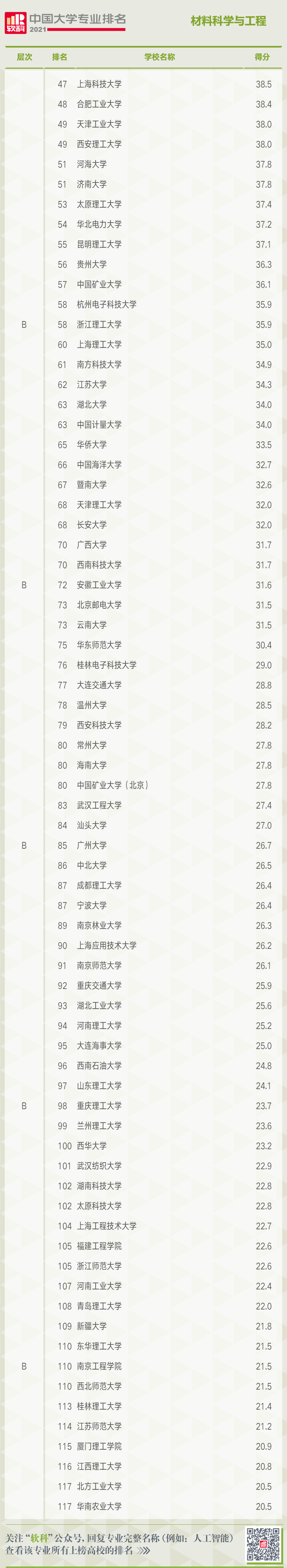 在材料科学与工程专业排名中,共有118所高校上榜,A+层次的高校依次为清华大学、上海交通大学、北京航空航天大学、华南理工大学。