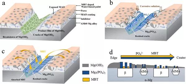 自修复涂层可以抑制镁合金从受损区域腐蚀。有鉴于此,中科院金属所材料腐蚀与防护中心韩恩厚、宋影伟团队报道了一种双相自修复涂层,在微弧氧化(MAO)膜的孔隙中负载相间抑制剂,并在面漆中掺杂有机抑制剂,以提高自修复性能。文中表征了两种抑制剂之间的协同作用和涂层的自修复性能,并研究了释放和愈合过程。研究结果表明,2-巯基苯并噻唑(MBT)可以吸附在形成的Mg3(PO4)2和Mg(OH)2薄膜的缺陷之上,从而借助协同作用进一步抑制腐蚀过程。当自修复涂层受损时,磷酸根离子可以从MAO膜中快速释放,而MBT从面漆中缓慢释放,它们协同抑制损坏区域的腐蚀,与单独添加每种抑制剂相比,大大提高了其自愈性能。