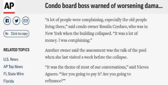 如下图所示,在《今日美国》的一位记者在社交网络上发布了介绍业主们在楼塌前一直纠结修理费用的报道后,评论里就有不少留言认为虽然遇难的业主们很值得同情,但不愿意付钱的他们也并不是没有问题。