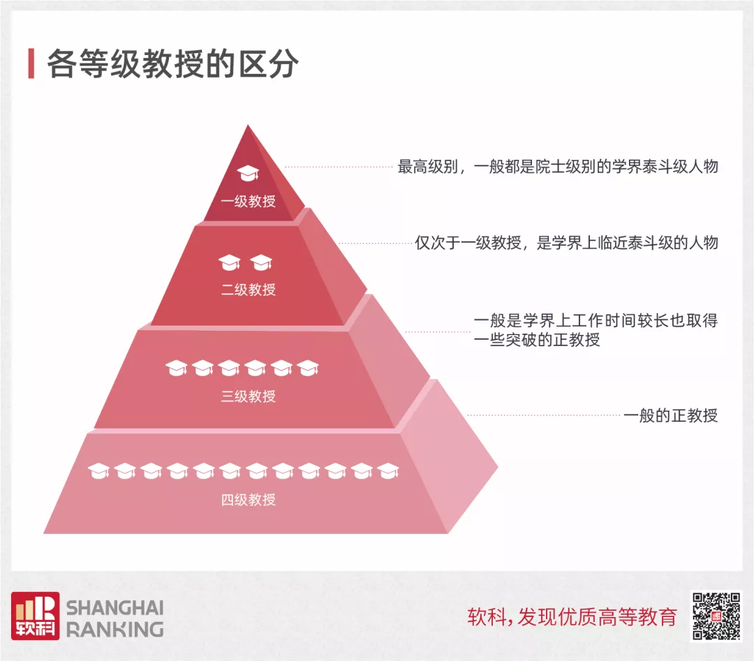 一级到四级的教授梯队,也呈金字塔型。一级教授的含金量最高,能被评上的人数也是少之又少;而教育部和人事部在《关于印发高等学校、义务教育学校、中等职业学校等教育事业单位岗位设置管理的三个指导意见的通知》中规定了高等学校高级岗位内部不同等级之间的结构比例全国总体控制目标:二级、三级、四级岗位之间的比例为1:3:6。