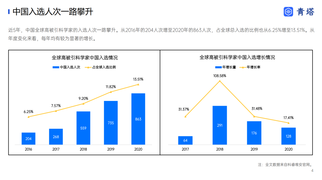 近期,青塔对近5年来中国高校在科睿唯安全球高被引科学家榜单中的表现情况进行了深入解读,重磅发布《全球高被引科学家入选研究报告》。报告从全球视角审视了中国学者近些年来活跃的科研表现,从学科及高校两个层面剖析了中国学者的上榜情况,同时对中国未来入选的增长机会及提升空间进行了分析。