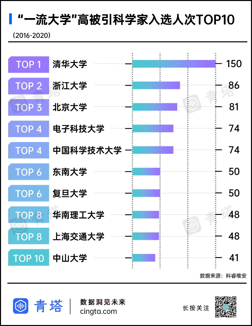 “一流大学”建设高校中,清华大学5年入选科睿唯安高被引科学家150人次,高居全国高校榜首,浙江大学、北京大学表现优异,5年间入选人次在80以上。