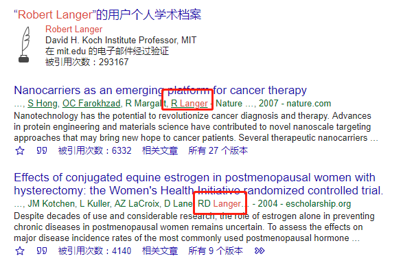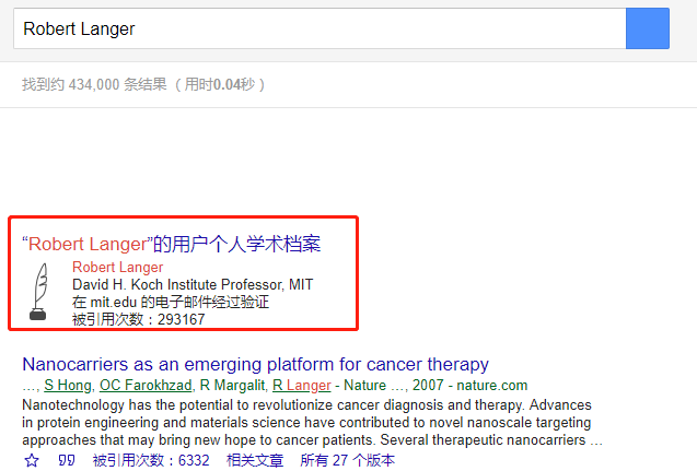 搜索 Robert Langer,我们可以直接打开上面那个带有羽毛的人名。