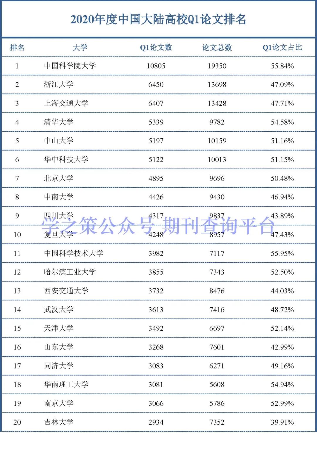 为了反映各个高校发表论文的质量,本期我们整理了2020年度中国大陆高校在Q1期刊(JCR分区)上发表论文的情况。