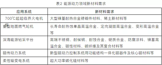 以煤炭为主和油气资源紧缺的能源结构,决定了我国国家能源战略发展重点在于发展新一代高效清洁燃煤发电技术和深海油气资源开发技术。先进能源动力系统用特种合金代表国家高端装备核心竞争力,属于国家战略型新材料范畴,是我国抢占技术制高点的重大机遇。核电、油气开发等能源领域重大项目对特种合金、稀土材料、非晶材料、超导材料、复合材料等新材料提出急迫需求(见表 2)。