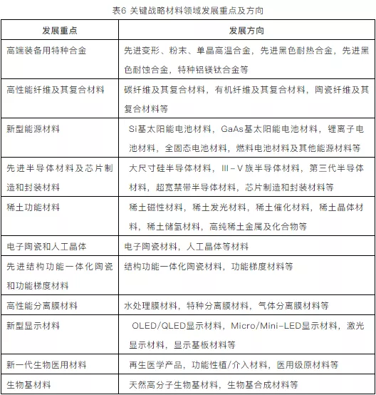 关键战略材料领域发展重点及发展方向主要包括高端装备用特种合金、高性能纤维及其复合材料、新型能源材料、先进半导体材料及芯片制造和封装 材料、稀土功能材料、电子陶瓷和人工晶体、先进结构功能一体化陶瓷和功能梯度材料、高性能分离膜材料、新型显示材料、新一代生物医用材料及生物基材料等(见表6)。