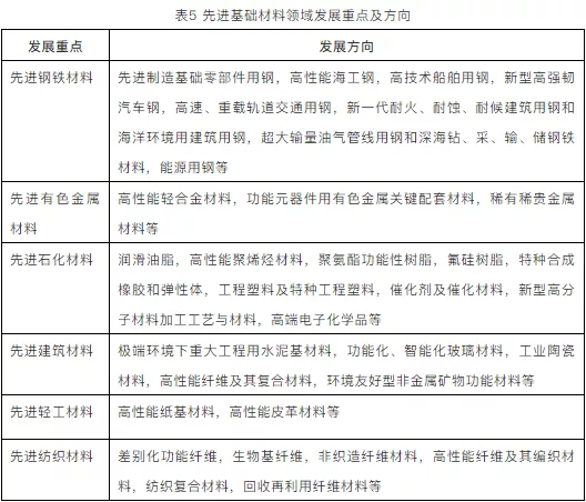 先进基础材料领域发展重点及发展方向主要包括先进钢铁材料、先进有色金属材料、先进石化材料、先进建筑材料、先进轻工材料及先进纺织材料等(见表5)。