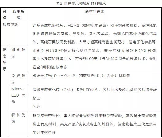 集成电路与信息显示是我国电子信息产业的两大基石,是信息领域为数不多的千亿美元级产业,带动力和辐射力极强,在我国国民经济中占有极其重要的战略地位,信息显示领域新材料需求见表3。新型信息技术及产业的发展需要电子信息材料支撑,当前我国电子信息材料研发技术与发达国家存在较大差距。