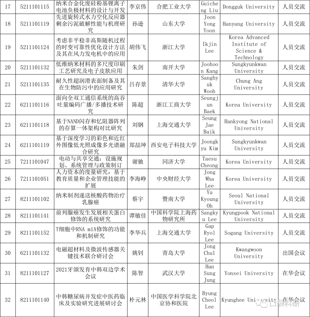 根据国家自然科学基金委员会(NSFC)与韩国国家研究基金会(NRF)的合作协议,双方每年共同征集和资助中韩研究人员之间的人员交流项目和双边学术研讨会项目。2021年度,经过公开征集,共受理人员交流项目申请127项,双边学术研讨会项目申请9项。根据专家评审结果并经双方机构协商,拟对以下29项人员交流项目和3项双边学术研讨会项目予以资助。人员交流项目的执行期为2022年1月1日至2023年12月31日,双边学术研讨会项目的执行期为2021年10与1日至2022年12月31日。