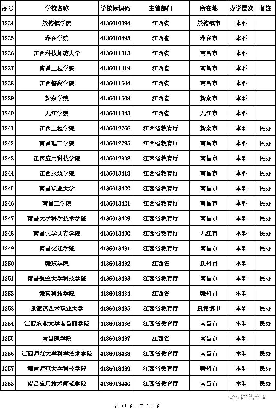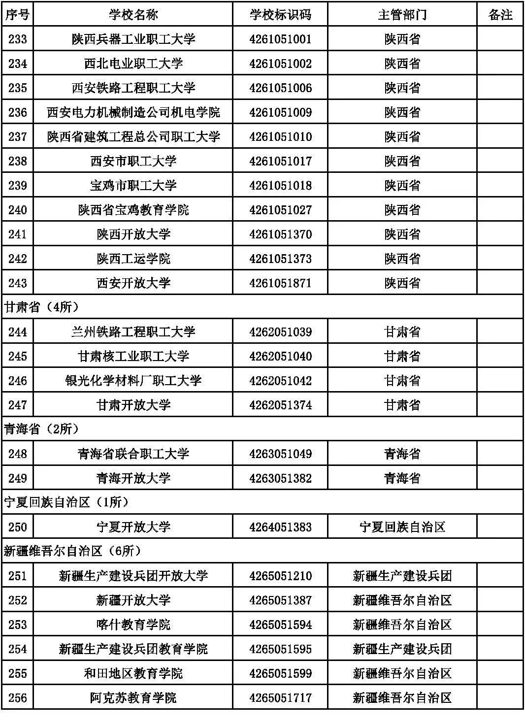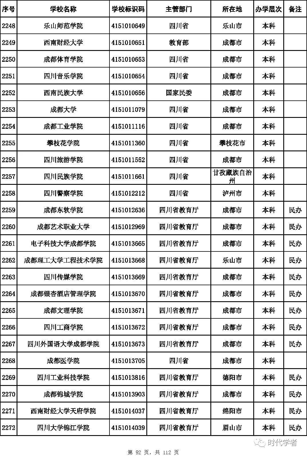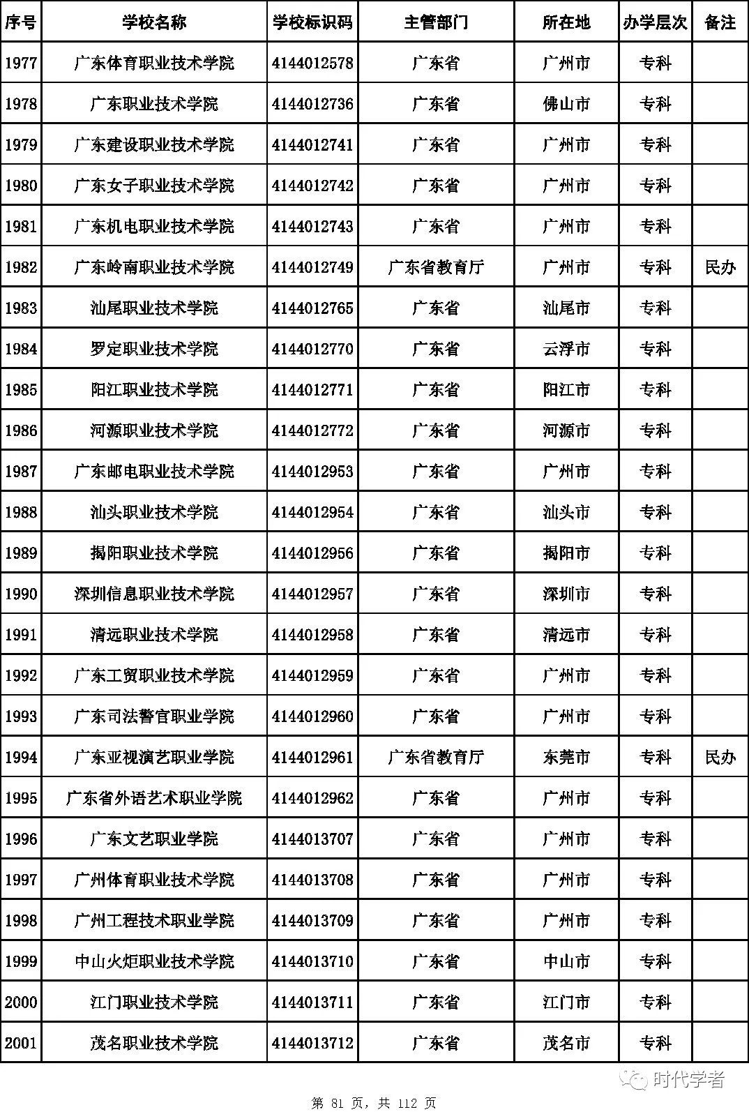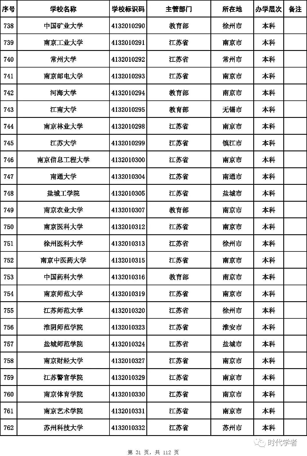 截至2021年9月30日,全国高等学校共计3012所,其中:普通高等学校2756所(本科1270所、专科1486所),成人高等学校256所。本名单未包含台湾省、香港特别行政区和澳门特别行政区高等学校。