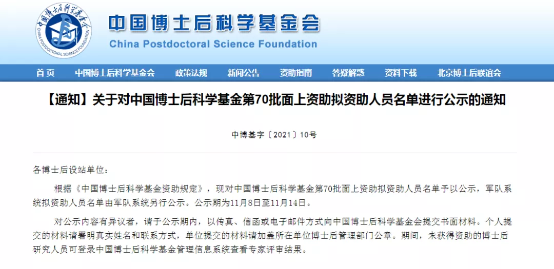 根据《中国博士后科学基金资助规定》,现对中国博士后科学基金第70批面上资助拟资助人员名单予以公示,军队系统拟资助人员名单由军队系统另行公示。公示期为11月8日至11月14日。
