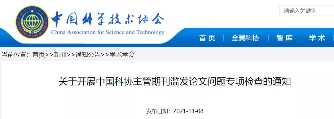 11月8日,中国科协网站发布关于开展中国科协主管期刊滥发论文问题专项检查的通知。