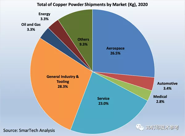 2020年按市场分布的铜粉出货量占比(公斤)(来源:SmarTech)