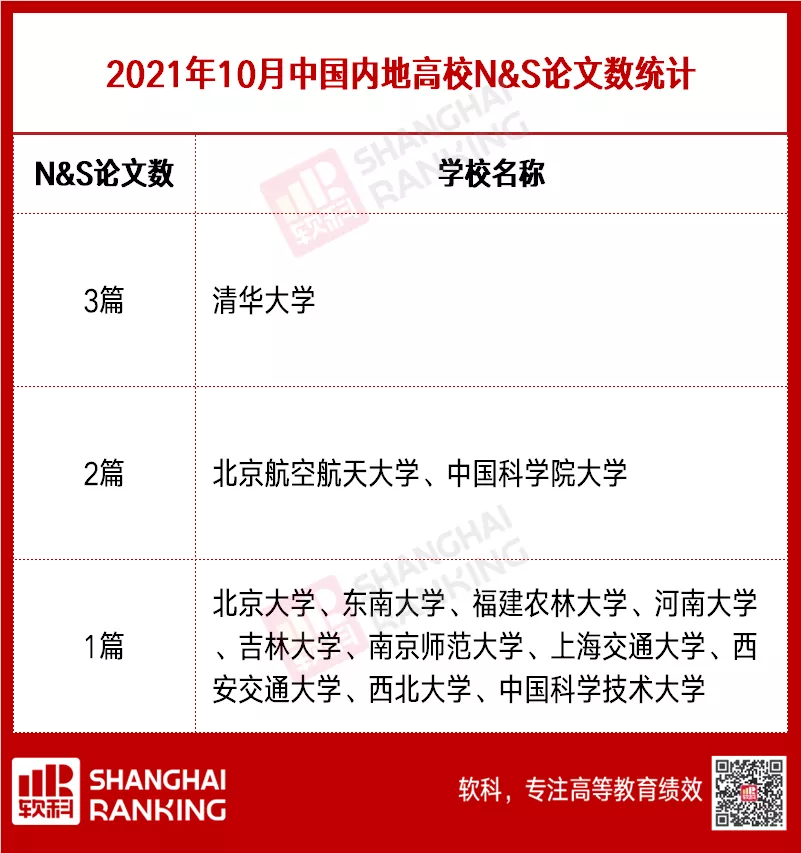 2021年10月,中国内地高校作为通讯作者(含共同通讯作者单位)在Nature和Science(简称N&S)期刊总计刊出原创论文13篇(Nature中类型为Article的论文,Science中类型为Research Article和Report的论文),其中Nature论文8篇,较上个月多了1篇,Science论文5篇,与9月份持平。