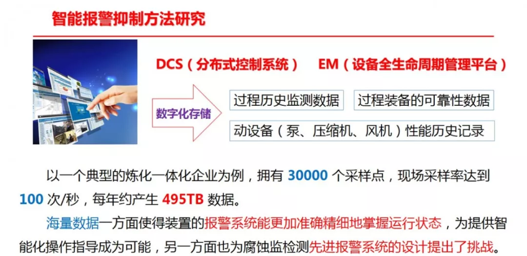 然而,如某炼化公司统计,其在各个装置运行期间,DCS系统每天会产生过程归档数据约4.7亿个,2015年10月期间产生各类报警信息约8500条,工艺操作记录约9500条,这些工艺管理、设备管理和安全管理的基础信息,使用率却不及每天归档的4.7亿个的10%。