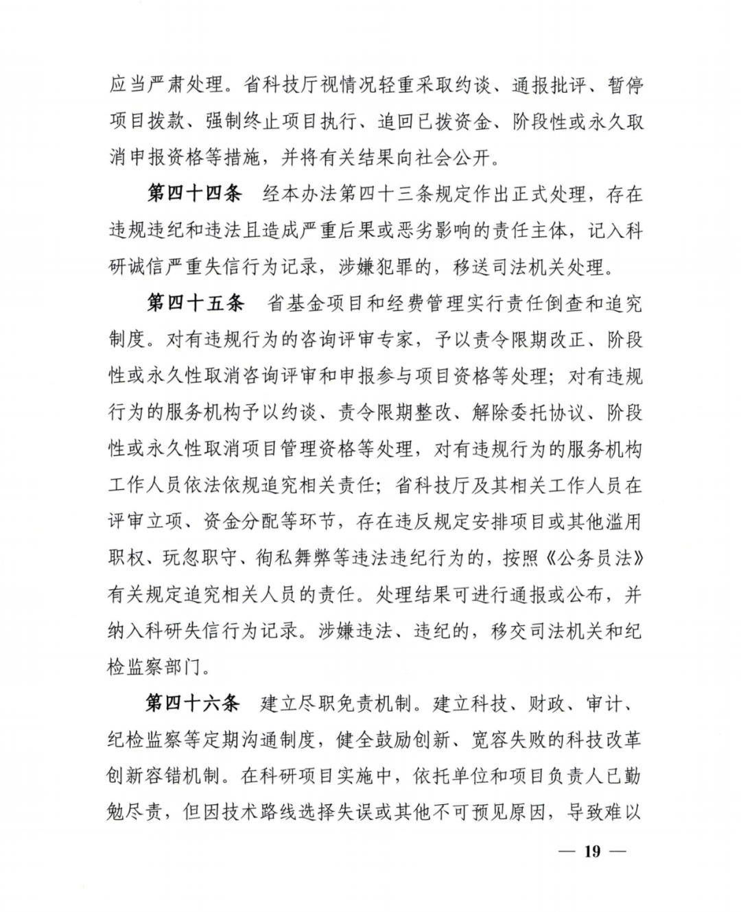 第十九条专项资金实行专账核算、专款专用。省科技厅根据不同类型科研项目特点、研究进度、资金需求等,按规定及时下达和拨付项目资金,科研项目资金不纳入部门预算执行考核。任何部门不得截留、挤占、挪作他用。项目依托单位要按照国家有关财务制度规定和项目任务书要求,加强对项目经费的管理。
