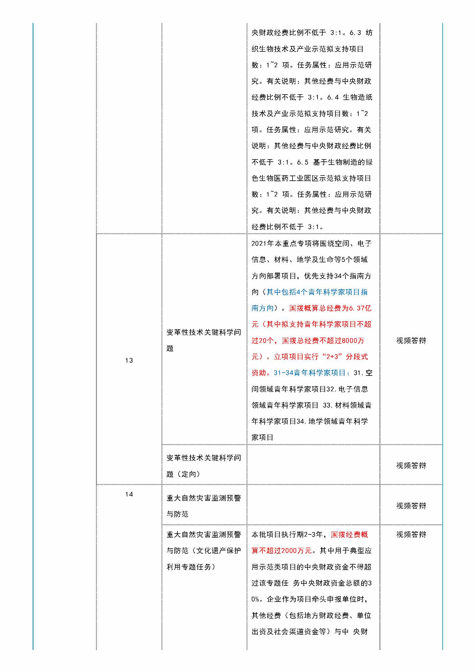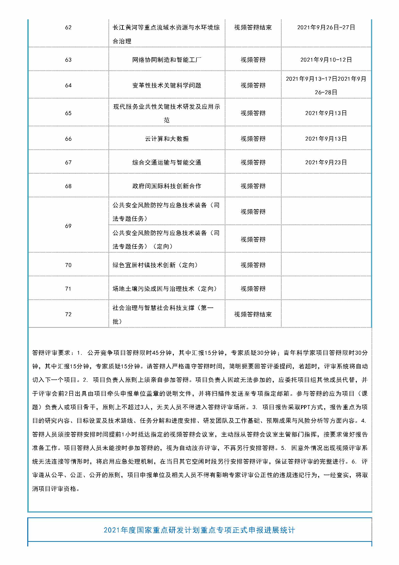 答辩评审要求:1. 公开竞争项目答辩限时45分钟,其中汇报15分钟,专家质疑30分钟;青年科学家项目答辩限时30分钟,其中汇报15分钟,专家质疑15分钟。请答辩人严格遵守答辩时间,简明扼要回答评委提问,若超时,评审系统将自动切入下一个项目。2. 项目负责人原则上须亲自参加答辩。项目负责人因故无法参加的,应委托项目组其他成员代替,并于评审会前2日出具由项目牵头申报单位盖章的说明文件,并将扫描件发送至专项指定邮箱。参与答辩的应为项目(课题)负责人或项目骨干,原则上不超过3人,无关人员不得进入答辩评审场所。3. 项目报告采取PPT方式,报告重点为项目的研究内容、目标设置及技术路线、任务分解和进度安排、研发团队及工作基础、预期成果与风险分析等方面内容。4. 答辩人员须按答辩安排时间提前1小时抵达指定的视频答辩会议室,主动服从答辩会议室主管部门指挥,按要求做好报告准备工作。项目答辩人员未能按时参加答辩的,视为自动放弃评审,不再另行安排答辩。5. 因意外情况出现视频评审系统无法连接等情形时,将启用应急处理机制,在当日其它空闲时段另行安排答辩评审,保证答辩评审的完整进行。6. 评审遵从公平、公正、公开的原则,项目申报单位及相关人员不得有影响专家评审公正性的违规违纪行为,一经查实,将取消项目评审资格。