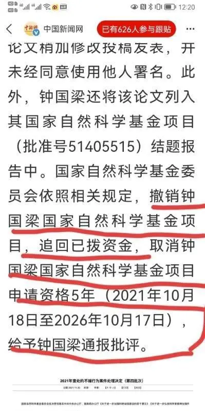 最近中南大学的博导钟国梁教授,在拒绝了他人的论文以后,署上自己的名字去发表了;被自然科学基金委员会彻查了;钟国梁以抄袭剽窃、未经他人同意署名将该论文用于自科基金项目的结题报考中。自科基金会做出了停止了钟国梁自科项目的五年申请资格,并追回本期已拨付资金,还遭到了通报批评的决定。这个处罚的影响力范围有限,只限在自科基金会的范围内。