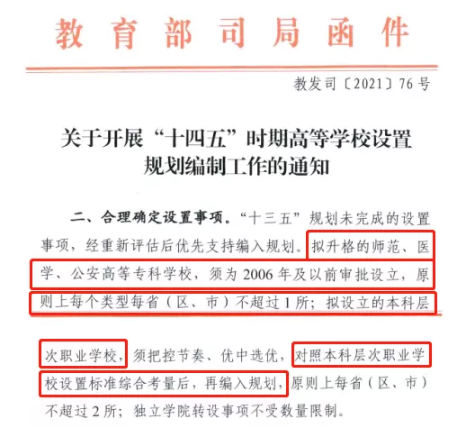 今年8月,教育部发展规划司发布《关于开展“十四五”时期高等学校设置规划编制工作的通知》,要求拟升格的师范、医学、公安高等专科学校,须为2006年及以前审批设立,原则上每个类型每省(区、市)不超过1所;拟设立的本科层次职业学校,须把握节奏、优中选优,对照本科层次职业学校设置标准综合考量后,再编入规划,原则上每省(区、市)不超过2所。