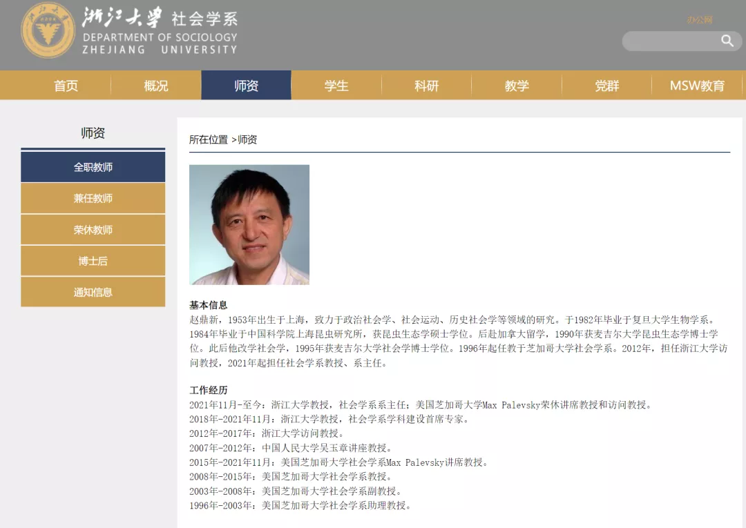 12月8日,浙江大学社会学系官网“全职教师”栏目更新信息显示,知名社会学家赵鼎新已于今年11月正式出任浙江大学教授,社会学系系主任。
