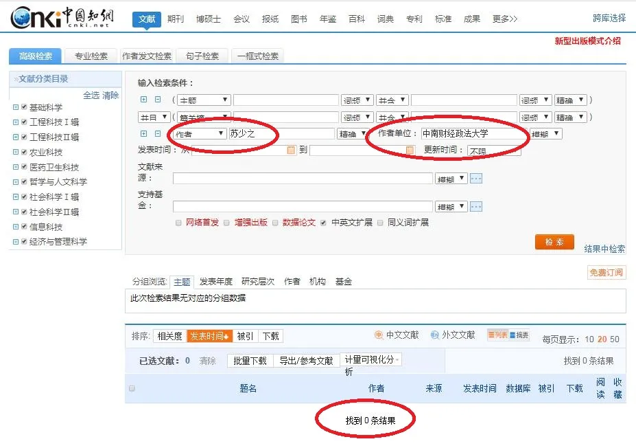 73岁的中南财经政法大学退休教授苏少之,状告中国知网(运营方为《中国学术期刊(光盘版)》电子杂志社有限公司)维权成功后,他的论文也被中国知网下架了,在中国知网的作者栏目输入“苏少之”和作者单位栏目输入“中南财经政法大学”进行检索,显示结果为“0”。