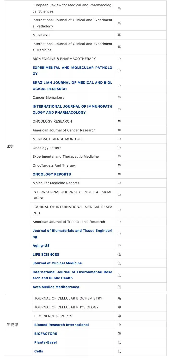 下表蓝色字体为减少的期刊名单