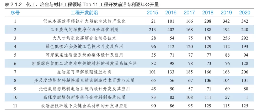 化工、冶金与材料工程领域研判,得到的Top11工程开发前沿见表2.1.1。其中“工业废气的深度净化与资源化利用”,“可穿戴柔性智能系统的整体设计及应用”,“新型绿色智能二次电池中关键材料的研发及系统应用”,“生物基可降解聚酯橡胶材料”和“高强度耐腐蚀新型轻合金材料制备及应用”是基于科睿唯安提供的核心专利聚类得出,另外6个开发前沿为专家提出。“低成本高效率钙钛矿太阳能电池的产业化”作为新兴的能源技术,其专利被引用次数并不高(表2.1.1),但核心专利数呈现明显上升趋势(表2.1.2)。“新型绿色智能二次电池中关键材料的研发及系统应用”仍然是受到广泛关注的方向,其专利篇均引用高,达到10.3次,近年来核心专利数量仍然没有减少。“高强度耐腐蚀新型轻合金材料制备及应用”平均引用次数达到14.19次,但其核心专利数呈下降趋势。